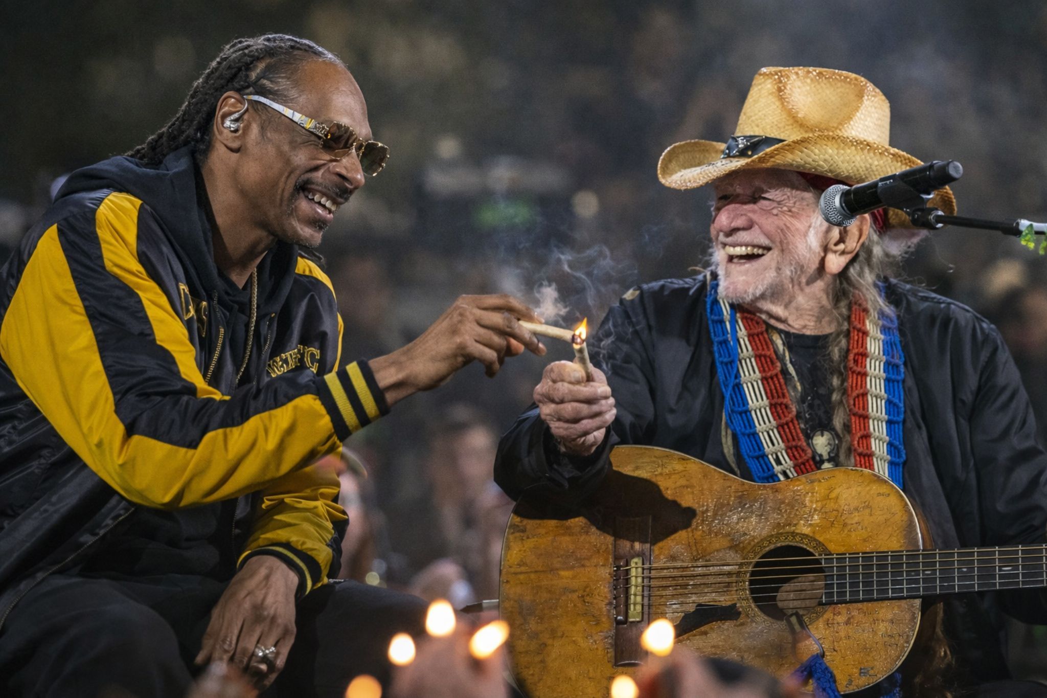 And when Snoop Dogg steps out—cool as midnight, completely at home—it stops being a “crossover” and becomes something older and simpler: chemistry. Two legends from different maps, sharing the same compass. They don’t have to prove anything. They just lock into that deep, unhurried groove where the band sounds like it’s breathing with them, not backing them. The song choice—“Roll Me Up and Smoke Me When I Die”—plays like a wink, yes, but it also lands as a statement about aging, freedom, and the right to laugh at the clock without denying it’s ticking.