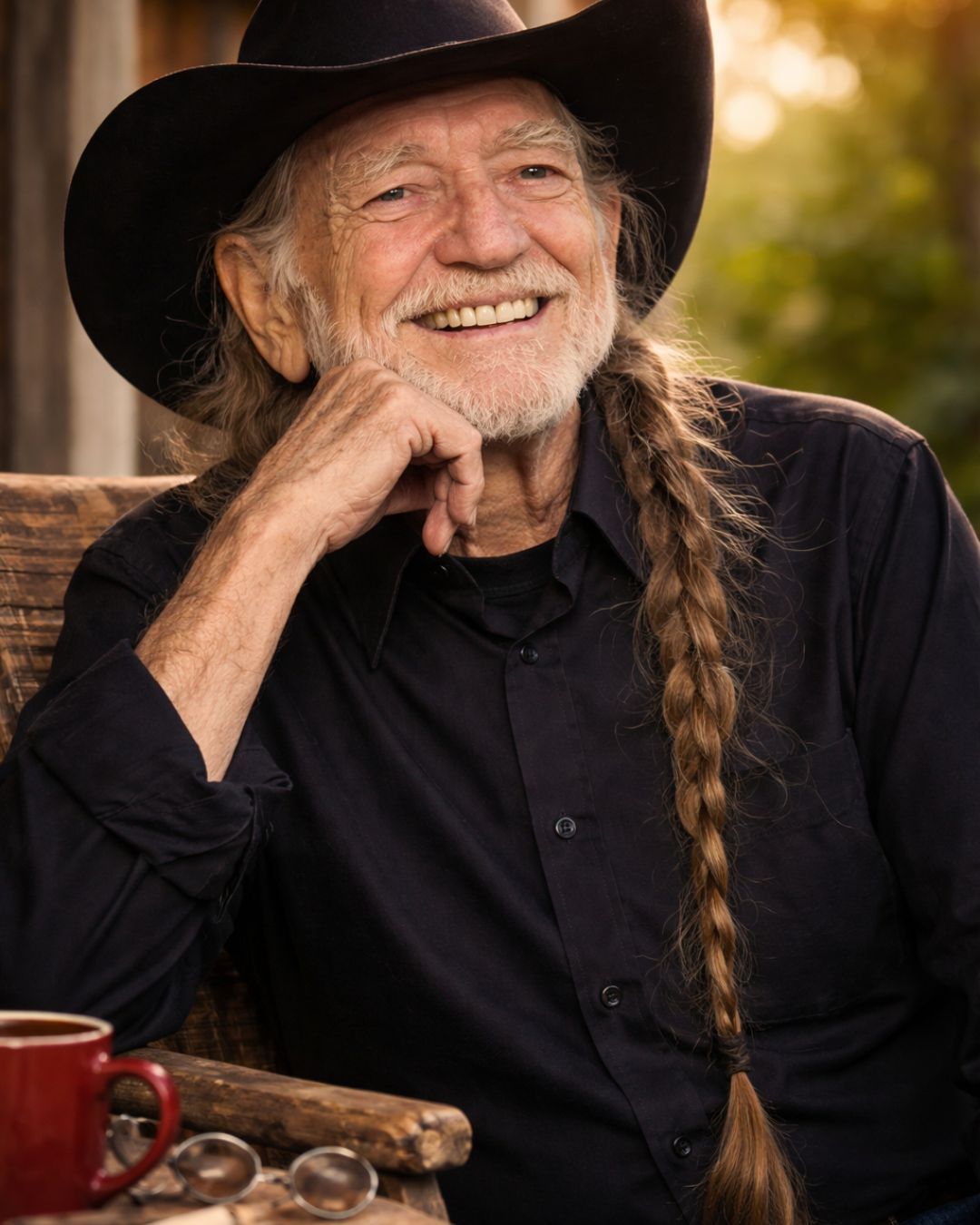 Willie Nelson doesn’t need a spotlight to feel legendary. Sometimes all it takes is a single image in your mind: that gentle grin, the hand resting easy on his chin, the old cowboy hat tilted just so—like it’s always belonged there, through every mile and every hard turn. In a world that constantly begs for noise, this kind of quiet presence feels almost radical. It isn’t just a calm afternoon look. It’s the expression of a man who has weathered more than most of us could name—and still chooses warmth.